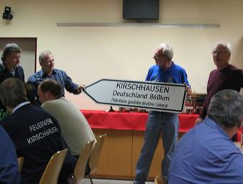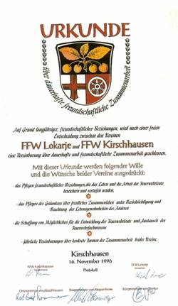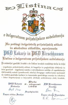 Sodelovanje lokarskih gasilcev in gasilcev iz kraja Kirschhausen v Nemčiji Želja lokarskih gasilcev je vedno bila biti dobro usposobljeno in opremljeno gasilsko društvo, zato se je naše delo in aktivnost razširilo tudi izven naših meja. V letu 1986 smo izrazili željo za boljše gasilsko vozilo tudi našemu rojaku g. Francu Rančigaju, ki je na delu v tujini. Že čez nekaj časa nas je obvestil, da ima primerno vozilo za naše gasilsko društvo. V jeseni leta 1987 smo odšli v Nemčijo po gasilsko vozilo Unimog, katerega je kupil od prostovoljnega gasilskega društva Kirschhausen in ga podaril lokarskim gasilcem. Želja gasilcev iz Kirschhausena je bila, da želijo spoznati gasilce, ki bodo dobili omenjeno gasilsko vozilo. V letu 1988 so nam vrnili obisk z udeležbo 70 gasilcev, kateri so si ogledali naše kraje. Pokazali smo jim del naše lepe Slovenije. Z obiskom so bili zelo zadovoljni, zato so v letu 1989 organizirali njihov tradicionalen izlet za vse njihove člane društva. Izleta se je udeležilo 60 njihovih članov in prijateljev gasilstva iz Kirschhausna. Od četrtka 12.9. do nedelje 15.9. so si v enodnevnih izletih ogledali Rogaško Slatino, Bled, Postojnsko jamo in Šentjur z okolico. Organizirali smo jim tudi gasilsko mašo na Ponikvi. Zaključek z večerjo je bil v gasilskem domu. Sledila je naša in njihova 90-letnica delovanja društva, osamosvojitev Slovenije in hitro nemško priznanje naše države. Na njihovi paradi ob 90-letnici od 16-19. avgusta 1991 smo verjetno bili prvi slovenski gasilci z novo slovensko zastavo na njihovi paradi. Za nas udeležence parade so bili to nepozabni trenutki. V naslednjih letih so se vrstili obiski pri nas v Lokarjih, kakor tudi v Kirschhausnu. Obiski so temeljili na medsebojnem spoštovanju, na izmenjavanju strokovnih znanj iz področja gasilstva, kakor tudi na prijateljskem povezovanju. V mesecu novembru leta 1992 smo obiskali gasilce v Kirschhausnu. Ob tej priliki so nam podarili rabljeno gasilsko vozilo VW za prevoz gasilcev. Darila smo bili zelo veseli. Gasilski društvi sta ugotovili, da sodelovanje poteka izredno dobro. Odločili sta se, da v letu 1996 podpišeta listino o pobratenju. Listino o pobratenju smo podpisali v Sloveniji 2. avgusta 1996 in v Nemčiji 16. novembra 1996. Ob podpisu listin sta bila prisotna tudi oba župana občin.