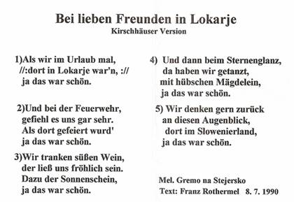 Ansambel Lojzeta Slaka na otvoritvi novega gasilskega doma Gasilsko društvo Lokarje je v osemdesetih začelo sodelovanje s prostovoljnim gasilskim društvom iz Nemčije, iz kraja Kirschhausen. Sodelovanje se je začelo po tem, ko so lokarski gasilci izrazili željo po novem avtomobilu. Le-tega (gasilski avtomobil Unimog) sta jim podarila Franc in Hermina Rančigaj, ki sta ga kupila od gasilcev iz Kirschhausena. Gasilci iz Kirschhausena pa so izražili željo, da spoznajo gasilce, ki bodo dobili omenjeni gasilski avtomobil. Tako so se prvič srečali v Nemčiji, na predbožičnem Miklavževem večeru. Leta 1988 so gasilci iz Kirschhausena prišli na obisk v Slovenijo. Bili so navdušeni nad Slovenijo, zato so že naslednje leto organizirali izlet za vse njihove člane društva. Od takrat se gasilci obeh društev vsakoletno srečujejo v Lokarjih ali pa v Kirschhausenu, še zlasti pa ob posebnih jubilejih. Leta 1996 so podpisali listino o sodelovanju, najprej avgusta v Sloveniji in nato novembra še v Nemčiji. Ob podpisu listin sta bila prisotna oba župana občin. Gasilci iz Kirschhausena so na melodijo slovenske ljudske pesmi Gremo na Štajersko, naredili priredbo v nemškem jeziku.